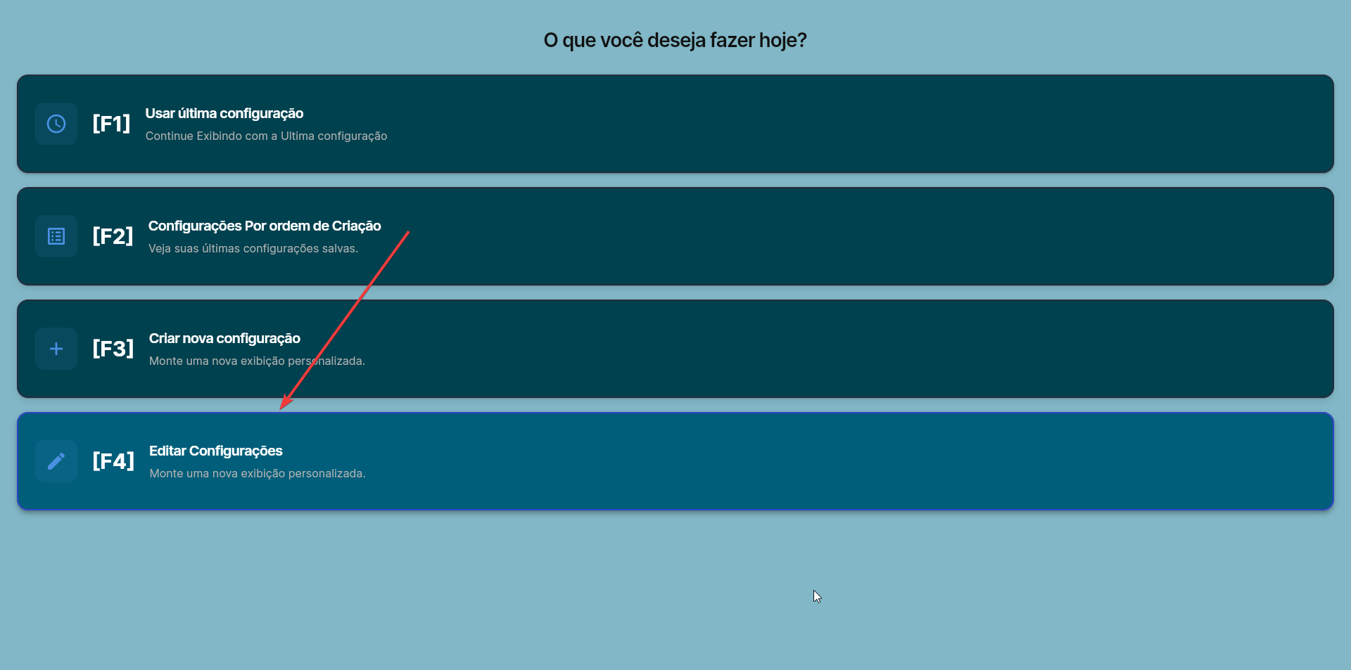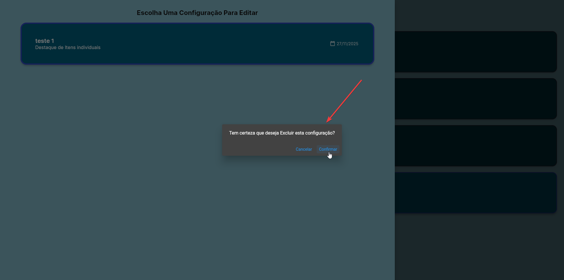 1. Acesse a 4ª opção – Editar Configuração. Na lista de configurações, pressione Backspace. Uma mensagem de confirmação será exibida; ao confirmar, a configuração será excluída.
