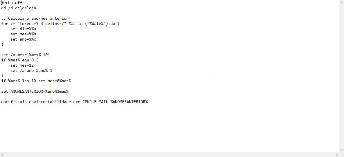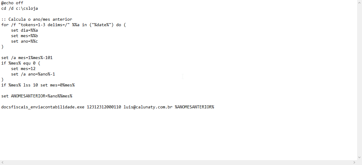 - Visando atender a necessidade do requerente, precisamos criar um .bat no arquivo do mesmo e deve ser colocando na pasta raiz do SYSLOJA (normalmente encontrada na C:\csloja) , segue o .bat. docs_fiscais_enviocontabilidade-windows7-BATEnvio.bat