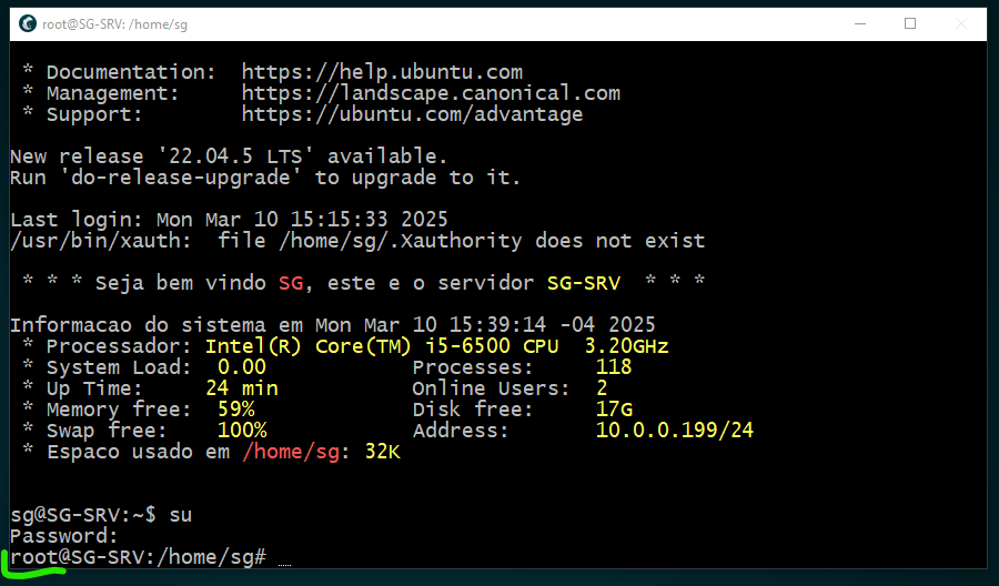 AGORA MUDAREMOS DE SG PARA ROOT, USANDO O COMANDO " su "