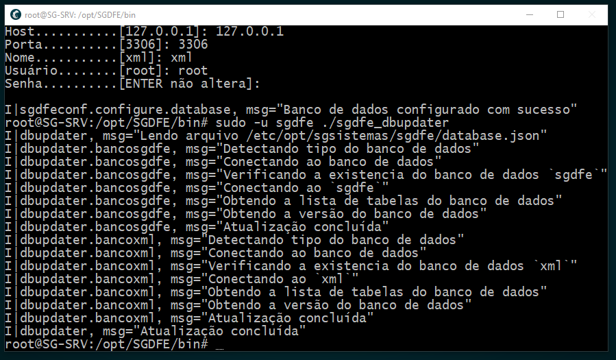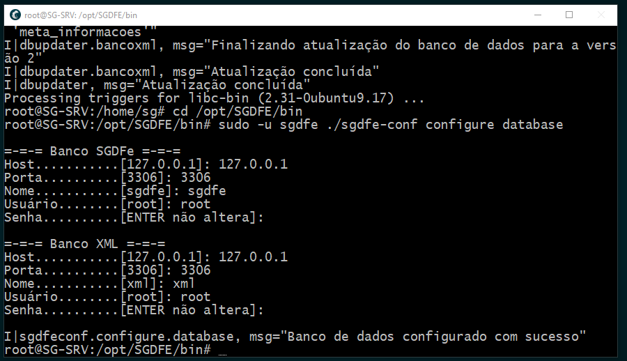 - " sudo -u sgdfe ./sgdfe-conf configure database " PREENCHER SEMPRE CONFORME ESTA PRE-CONFIGURADO, SENHA É DO MYSQL , PRESSIONAR ENTER PARA NAO ALTERAR - IRA FAZER 2 VEZES, PARA BANCO SGDFE E BANCO XML, TEM Q DAR A MSG DE SUCESSO CONFORME ABAIXO