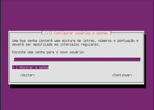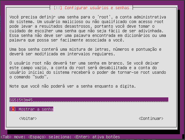 NESSA TELA CONFIGURA A SENHA DE ROOT, QUE DEVE SER "SG515t3m45" PARA TER CERTEZA Q DIGITOU CERTO, MARQUE A OPCAO MOSTRAR A SENHA E CONTUNUAR, NA PROXIMA TELA PEDE PRA CONFIRMAR A SENHA, FAÇA O MSM PROCESSO