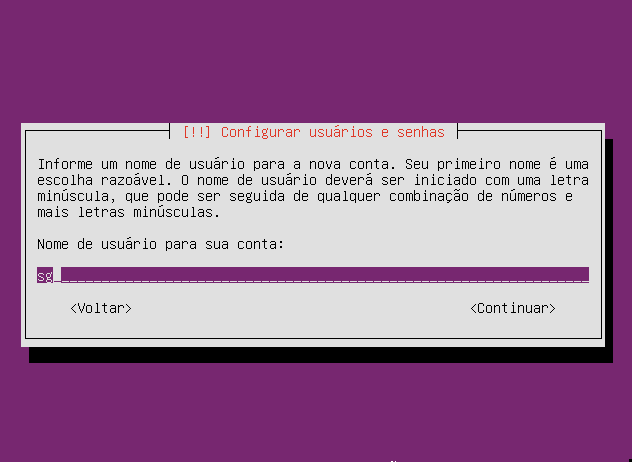 NESSA TELA AGORA CRIAREMOS O USUARIO SG, DIGITE "sg" MINUSCULO E CONTINUA